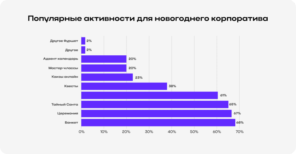 Но заметно растет доля командных активностей (60%), офлайн-и онлайн-квестов, квизов и мастер-классов.