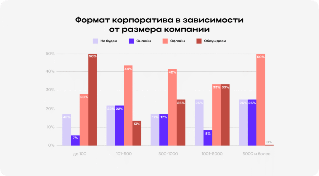Самые осторожные — малые компании до 100 сотрудников. 50% из них пока не определилась, а четверть – 28% всё же планирует офлайн. Средний бизнес (от 100 до 1000 сотрудников) — наоборот, активен и готов к празднику: 43% выбирают живые встречи, нередко добавляя к ним онлайн-элементы вроде стримов или интерактивных квестов.