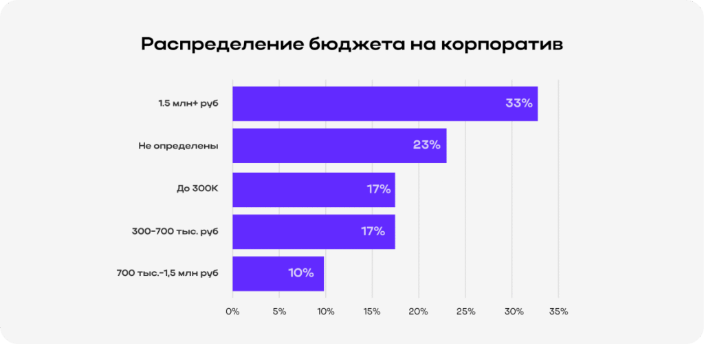 • В компаниях от 500 человек и выше практически не встречаются бюджеты ниже 300 тыс. рублей. Здесь корпоратив — это инструмент внутренней коммуникации.