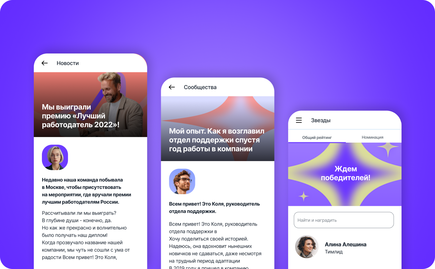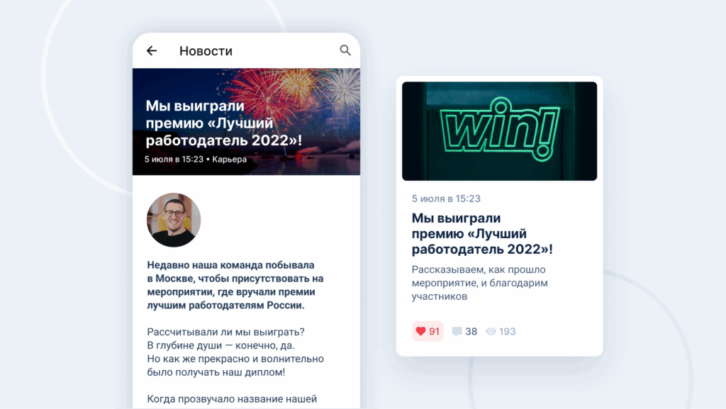Превращаем сотрудников в лидеров мнений, а корпоративную платформу— в источник экспертного и лайфстайл контента. Любой может стать автором личного блога: поделиться инсайтами с последнего проекта или рассказать о любимых книгах. Авторский контент от лидеров компании поможет передать опыт младшим коллегам, транслировать ценности и наставить в карьерном пути.