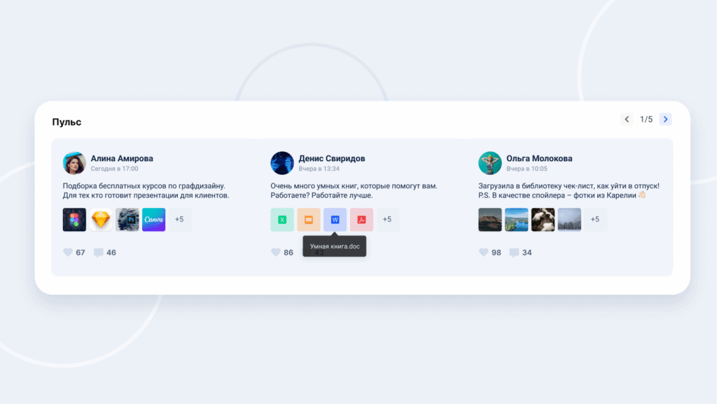 Тёплые отношения между сотрудниками — залог комфортной рабочей среды. Модуль создан по принципу ленты соцсетей и станет альтернативой заблокированным площадкам. Запостить мем, показать фото из отпуска или поделиться топом-5 любимых фильмов — Пульс вдохновляет на свободные обсуждения, интересный контент и дружеское общение.