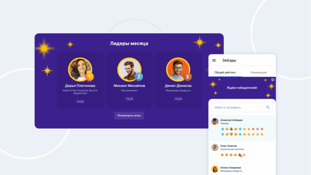 В модуле сотрудники могут публично делиться обратной связью о работе друг друга: благодарить за помощь, хвалить за достижения и отмечать сильные стороны. Работа сотрудников не остаётся незамеченной, а значит, мотивация и доверие в коллективе растут.