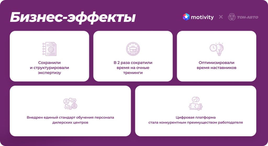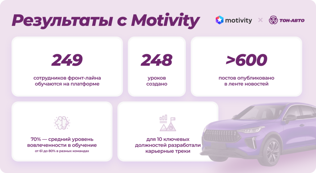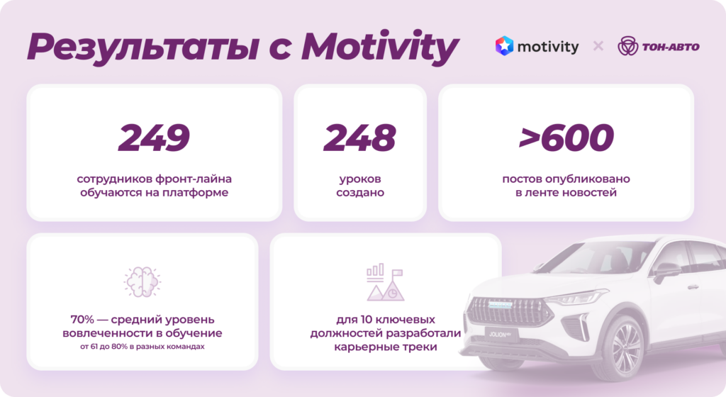 Группа компаний «Тон-Авто» — один из крупнейших автодилеров Поволжья — использует платформу Motivity уже 3 года. За это время компания не только преодолела кризис автомобильного рынка 2022 года, но и выстроила системное обучение для 250 сотрудников, разработала профессиональные треки для 10 ключевых должностей и запустила уникальные онлайн-марафоны, которые повысили вовлеченность команды.