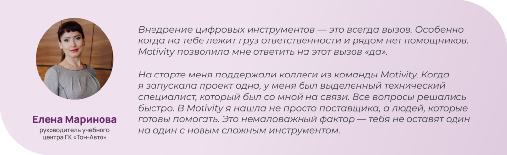 Сегодня Елена снова управляет проектом самостоятельно. Это стало возможным благодаря продуманной архитектуре обучения, оперативной поддержке Motivity и AI-ассистенту на платформе, который помогает быстро создавать и адаптировать обучающий контент.