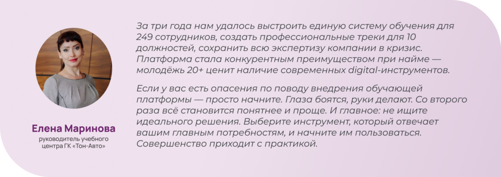 Решение о внедрении онлайн-обучения не принималось спонтанно. Ещё в 2021 году Елена, руководитель учебного центра ГК «Тон-Авто», начала изучать рынок LMS-платформ: встречалась с представителями разных провайдеров, тестировала демо-версии, изучала технические возможности систем. Она искала не просто хранилище для курсов, а инструмент, который поможет выстроить единую систему обучения для всей компании.