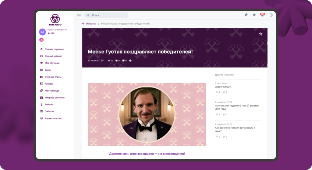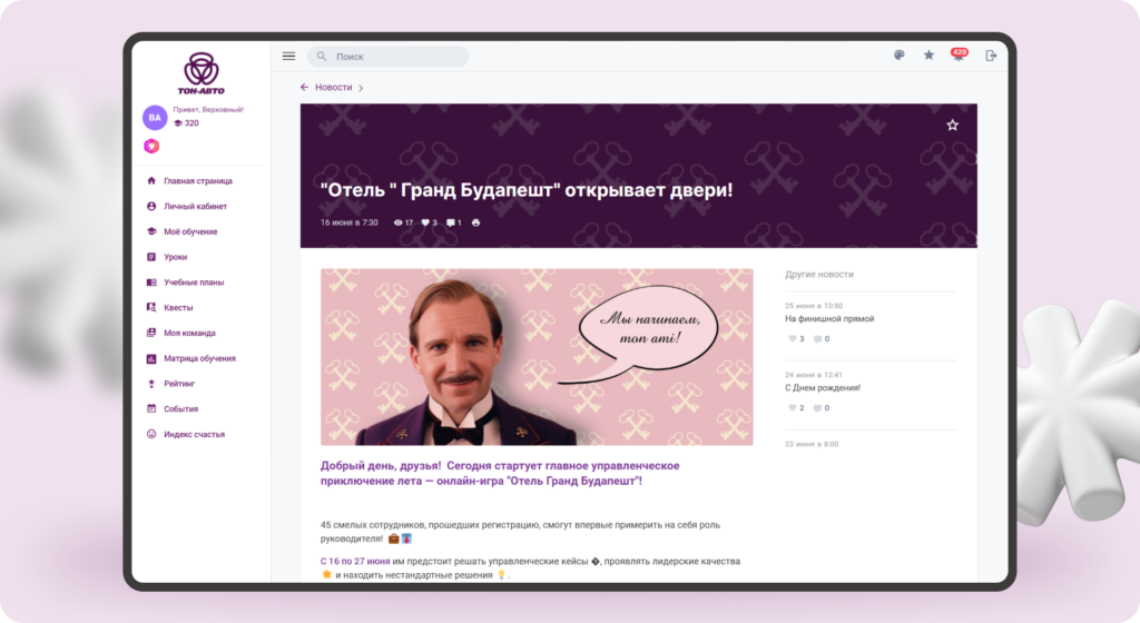 Второй марафон — игровой формат для тех, кто видит себя в роли будущих руководителей. Название «Отель Гранд Будапешт» сразу задавало тон. Участники становились управляющими отеля, и каждый день на платформе разыгрывались нестандартные ситуации: то странный гость с необычными запросами, то конфликт в команде, то неожиданная проверка. Сотрудникам нужно было находить решения, а самых успешных из них — выделили и наградили. Для проверки заданий использовали AI-ассистент Motivity — это значительно ускорило обработку ответов и позволило давать персонализированную обратную связь.