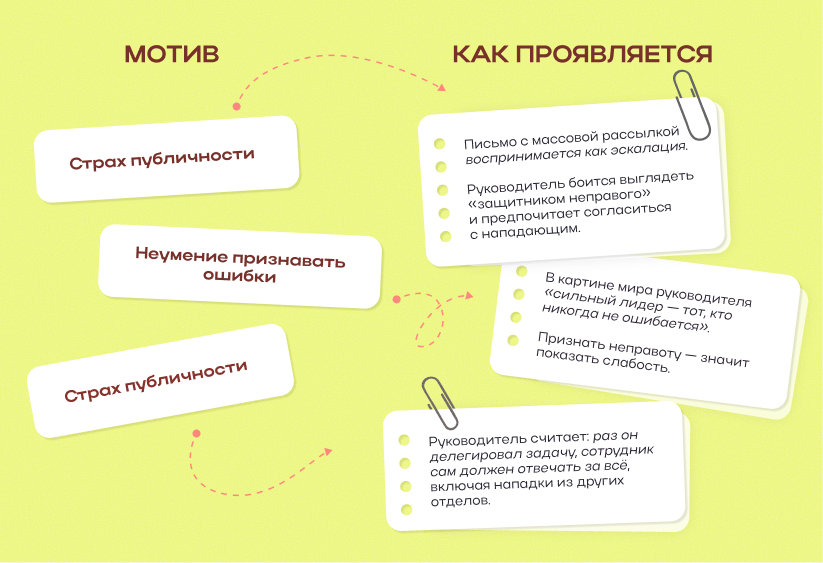 Грань здесь очень тонкая. Если сотрудники спорят о способе работы, сроках или формате взаимодействия, они правда могут договориться и сами, но тут другая ситуация. Если в конфликте уже появились публичные обвинения, давление, искажение фактов и риск для репутации сотрудника, руководитель обязан включаться. Разве может быть сильной команда, в которой каждый сам за себя?»