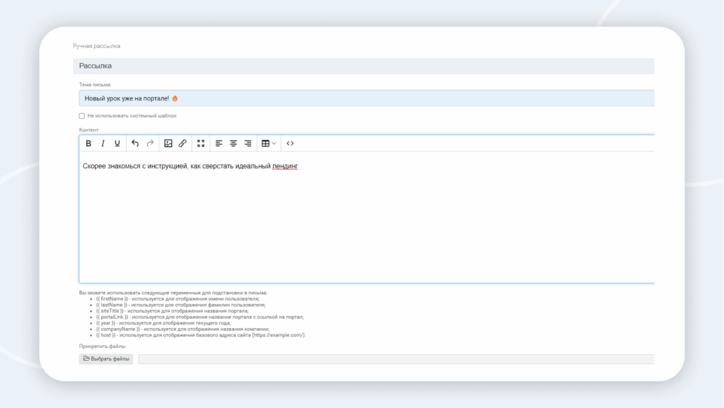 ❗️ Важно: чекбокс под темой письма «Не использовать системный шаблон» по умолчанию не отмечен — письма оформляются по стандартному шаблону системы. Если поставить галочку, письмо отправится так, как вы сверстали его сами. Чтобы создавать рассылки быстрее, мы рекомендуем использовать стандартный шаблон.