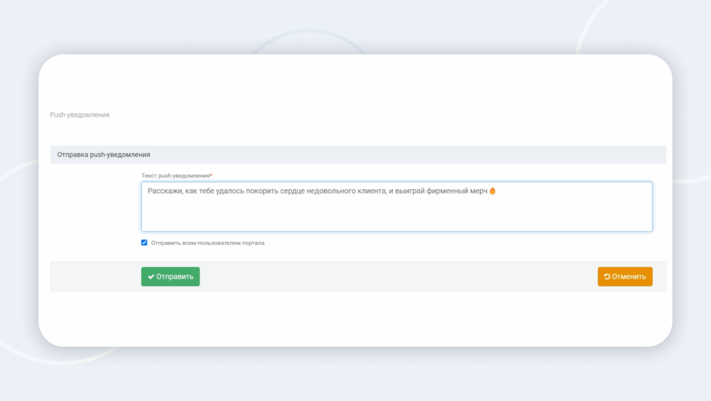 Чекбокс под текстом пуша «Отправить всем пользователям портала» по умолчанию отмечен — значит, пуш придёт всем пользователям. Чтобы настроить получателей, снимите галочку.