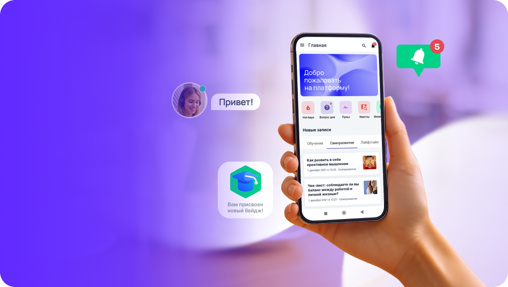 Открыл приложение по дороге на работу и день уже начался. Пролистал новости компании, прошел мини-курс по переговорам, обменялся мемами с коллегами и наметил карьерные цели. Всё это — за те 20 минут, что обычно уходят на скролл соцсетей в метро. С корпоративной мобильной платформой даже дорога до офиса становится возможностью для развития и общения.