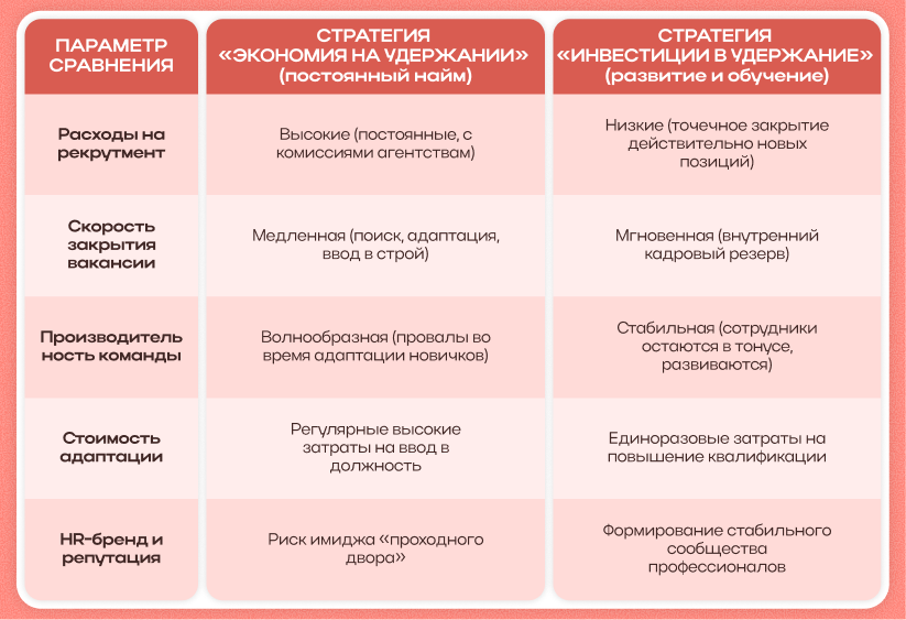 — Сравнение двух стратегий: постоянная замена сотрудников против системного развития и удержания.