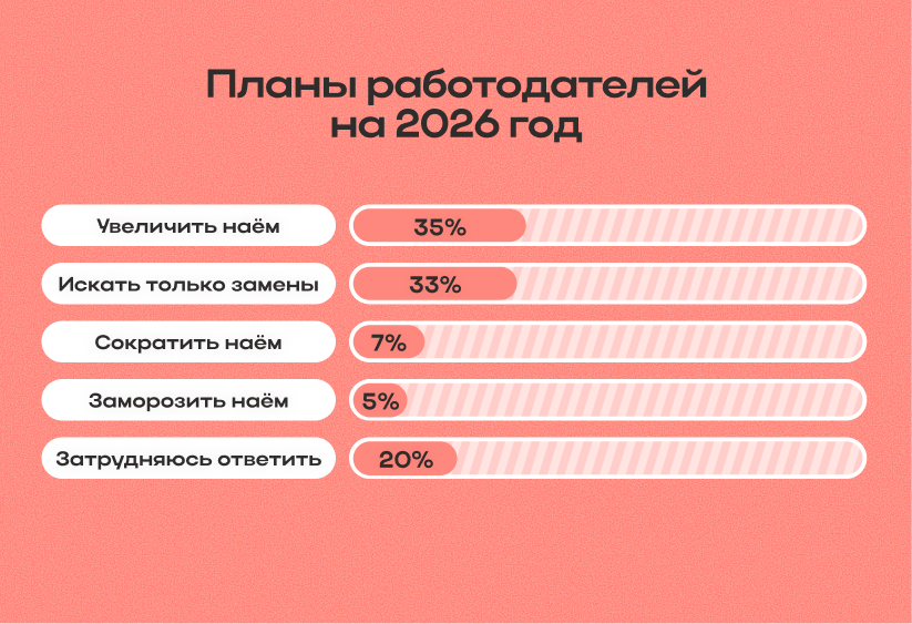 Взгляд в будущее, а именно планы работодателей в отношении найма сотрудников в 2026 году, выглядят сдержанно-оптимистичными. 35% компаний планируют увеличить наем, но 33% сосредоточатся лишь на поиске замены уходящим сотрудникам. Это подтверждает актуальный тренд на «заморозку» расширения штата в пользу точечного усиления позиций.