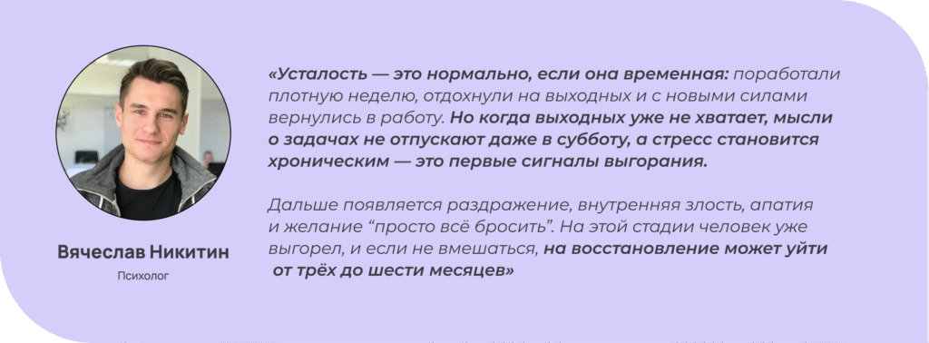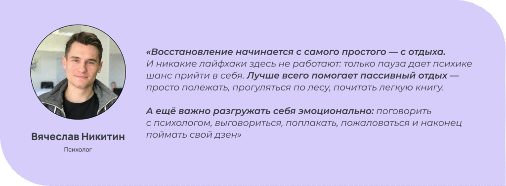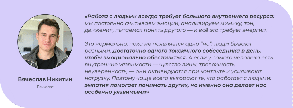 Это не лень и не усталость после тяжелой недели — это выгорание. Оно приходит тихо, маскируясь под раздражение и апатию, и чаще всего настигает тех, кто привык помогать другим, но забыл о себе. Разбираемся, как распознать выгорание и что с ним делать — вместе с нашим внутренним экспертом, психологом Вячеславом Никитиным.