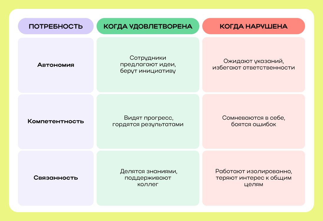 Эти три элемента работают как система: если один из них ослабевает, рушится равновесие. Когда автономию ограничивают жестким контролем — падает инициатива. Когда человек не чувствует компетентности — снижается уверенность и энергия. Когда нет связи с командой — исчезает чувство смысла.