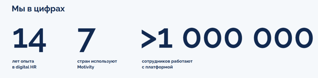| Технологии и практика наших клиентов в области развития лучших команд легли в основу продукта и методологии Motivity. | Сегодня мы помогаем компаниям внедрить передовые практики по примеру мировых лидеров рынка и построить основные HR-процессы, сформировать сильную команду и достигнуть выдающихся бизнес-результатов. |